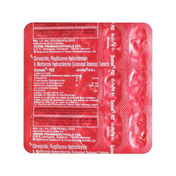 OZOMET PG2 TABLET manages type II diabetes mellitus when diet, exercise and management with single agent does not result in adequate sugar control. It is a combination of Glimepiride, Metformin and Pioglitazone which belongs to the group of medicines called Antidiabetic agents.