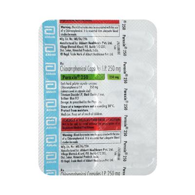PARAXIN 250MG CAPSULE contains Chloramphenicol which belongs to the group of medicine called Antibiotics. It is used to manage typhoid fever and other dangerous infections where other antibiotics are not effective.