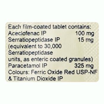 It contains a combination of Aceclofenac, paracetamol and serratiopeptidase as active ingredients. Aceclofenac and Paracetamol are pain relieving medicines which works by blocking the release of certain chemicals in the body that causes pain, inflammation and swelling. Serratiopeptidase is a protein-breaking enzyme which breaks down the abnormal proteins at the site of inflammation, thereby healing the affected areas.